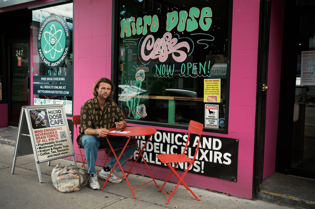The words “Microdose Café”, written in a giant yellow font on the awning outside a pink-colored storefront, are designed to generate attention. Plastered with ads for psychedelic shooters, mushroom elixirs, LSD, kratom, and “mind-enhancing beverages and brain tonics of all kinds,” the café door feels less like an entrance to a coffee shop and more like a portal to a trippy future and a weird afternoon.
