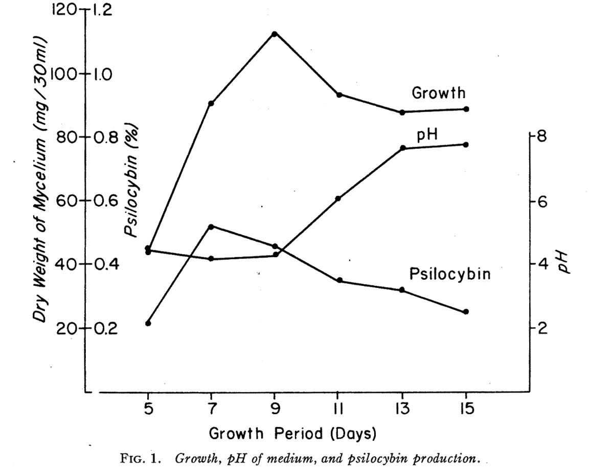 Graph showing typical relationship between psilocybin production, mycelial growth and liquid culture pH over a 15 day period. The researchers went on to further optimise growth conditions to produce a maximum of around 1% psilocybin.